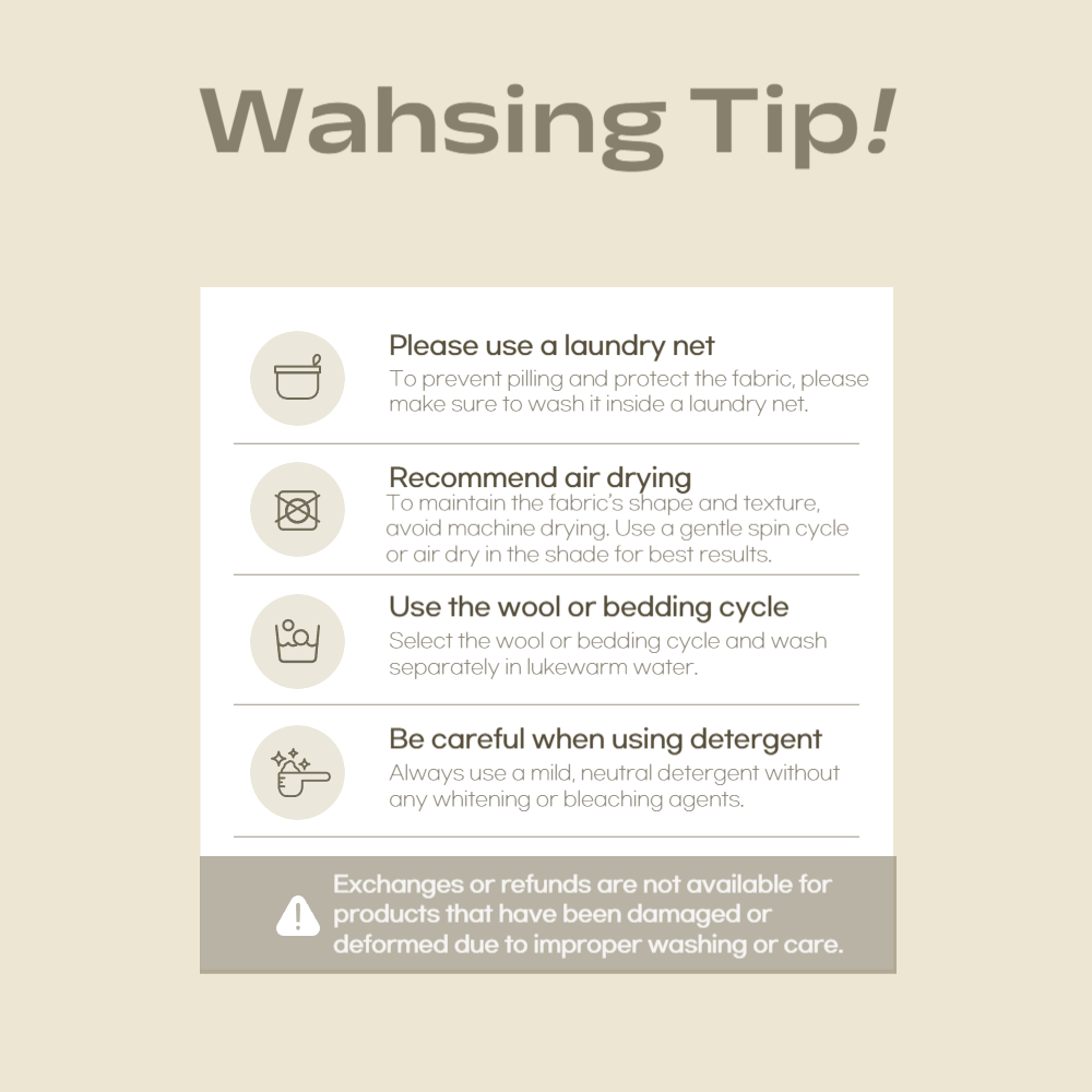 - Use a laundry net; wash separately on wool/bedding cycle in lukewarm water